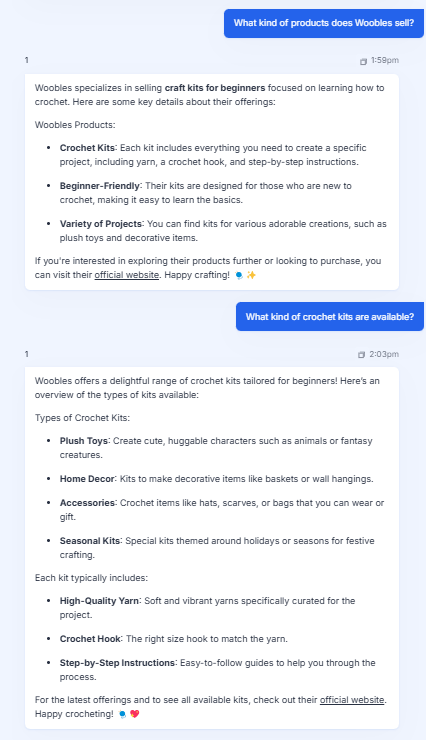 - A chatbot for the Woobles could help prospective customers pick what character they wish to crochet and then help them if they have issues during assembly.